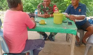 Batam (DK) – Bintara Pembina Desa (Babinsa) 06 Kelurahan Kasu Koramil 05/Belakangpadang, Serda O. Banjarnahor melaksanakan kegiatan Komunikasi Sosial (Komsos) dengan warga di wilayah binaan.