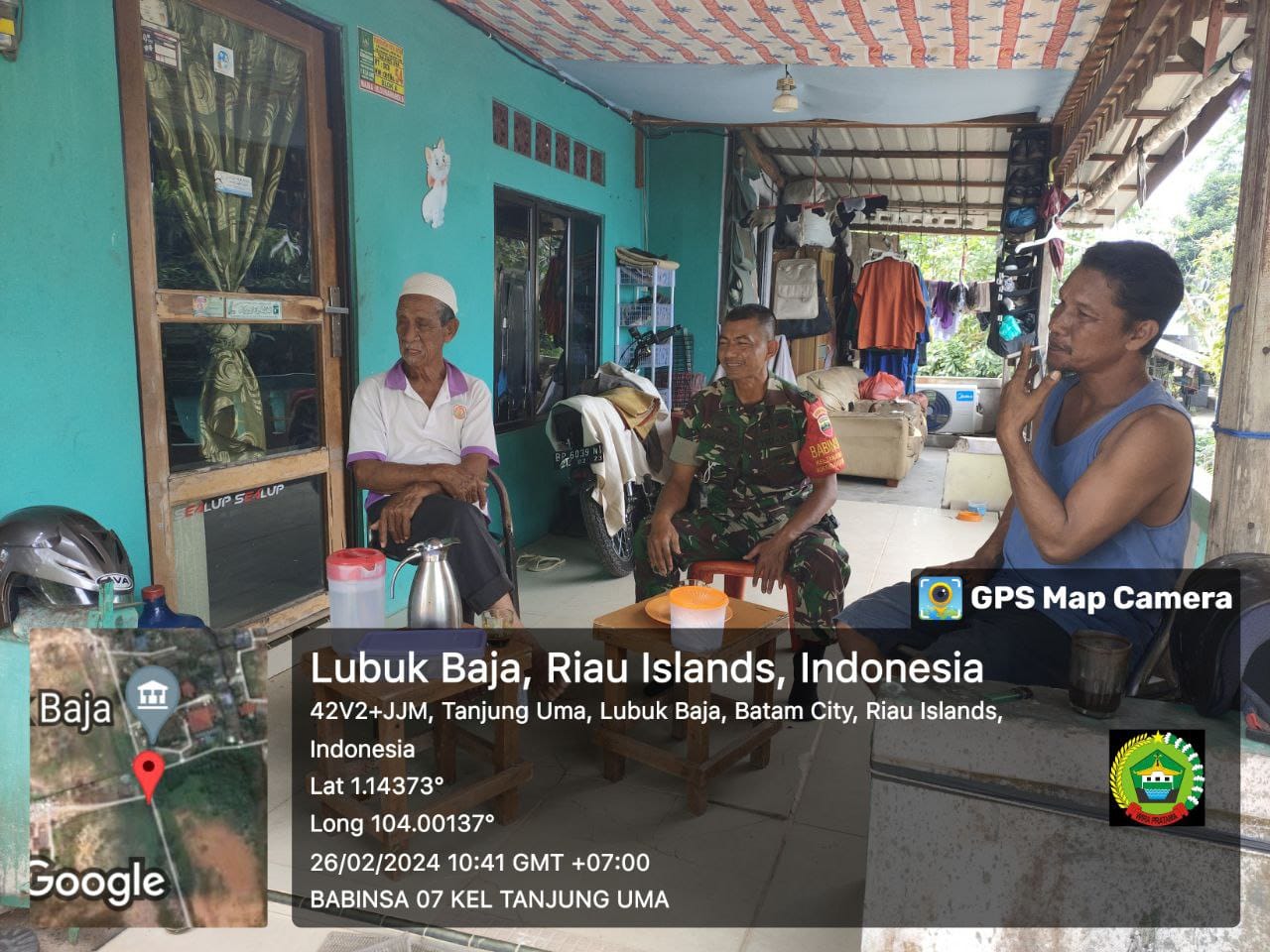 BATAM (DK)- Bintara Pembina Desa (Babinsa) 07 Kelurahan Tanjung Uma Koramil 01/Lubuk Baja Kodim 0316 / Batam, Serka Imam melaksanakan kegiatan Komunikasi Sosial (Komsos) dengan warga di wilayah binaan.