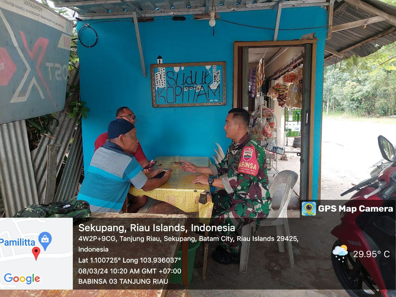 BATAM- (DK) – Bintara Pembina Desa (Babinsa) 03 Kelurahan Tanjung Riau Koramil 02/Sekupang, Serka Adang melaksanakan kegiatan Komunikasi Sosial (Komsos) dengan warga di wilayah binaan.