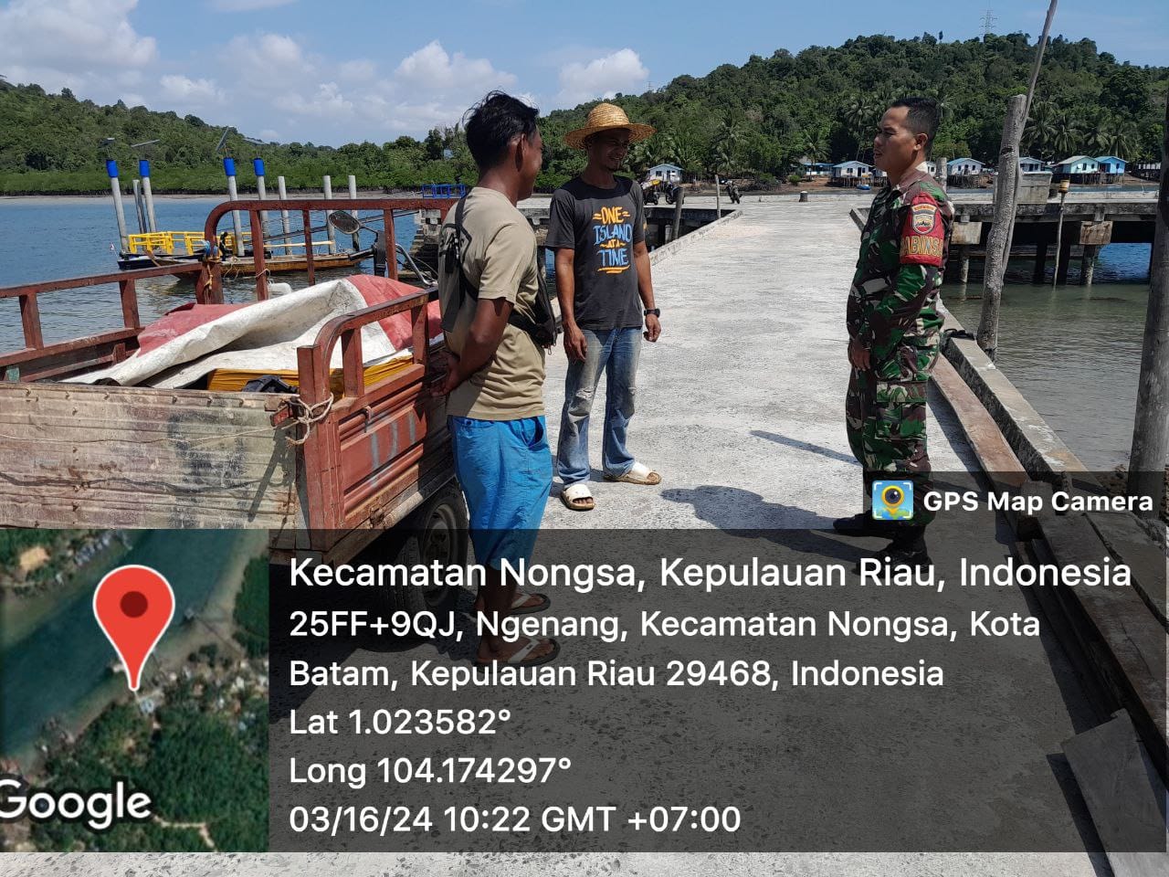 BATAM (DK)– Bintara Pembina Desa (Babinsa) 08 Kelurahan Ngenang Koramil 03/Nongsa, Sertu Alexsander melaksanakan kegiatan Monitoring wilayah seksligus Komunikasi Sosial (Komsos) bersama warga di wilayah binaan.