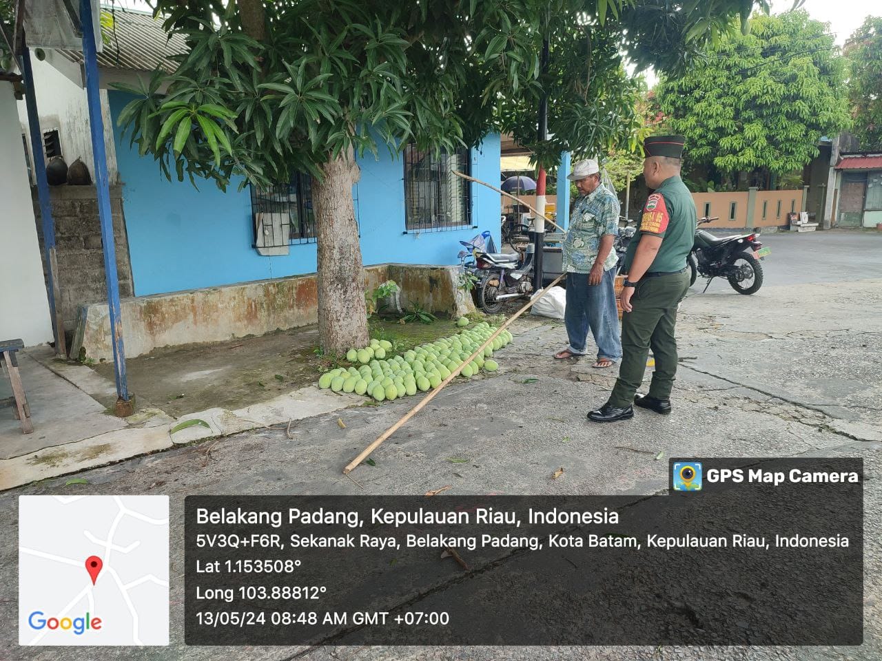 Babinsa berkomunikasi dengan bapak Suraji yang sedang memanen mangga di depan rumah warga, yang mana mangga tersebut akan di jual ke Batam. Babinsa berpesan agar selalu berhati hati dalam memanjat pohon mangga yang sudah tinggi dan tidak membiarkan sampah berserakan tetap menjaga kebersihan.