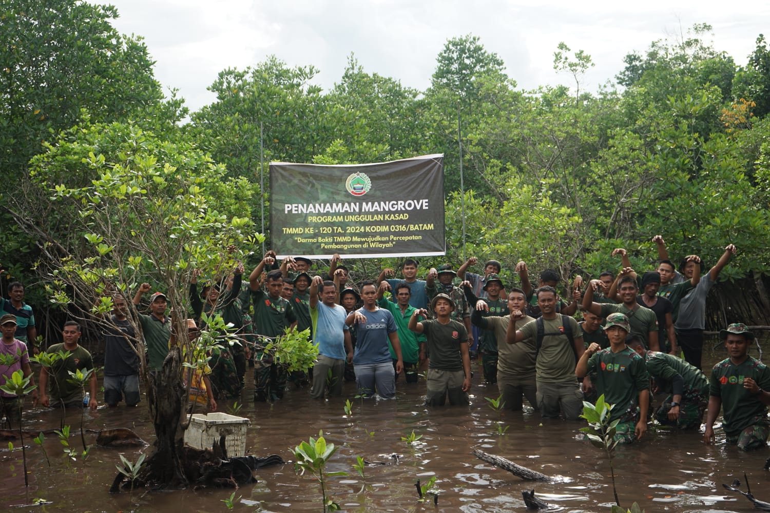 Batam[DK]- Satgas TMMD 120 Kodim 0316/Batam bersama warga melaksanakan kegiatan penanaman 1000 bibit pohon mangrove bertempat di Kampung tua teluk lengung, Rt 01/Rw 22, Kel Kabil, Kec Nongsa, Kota Batam, Kepri. Minggu [ 26/05/2024].