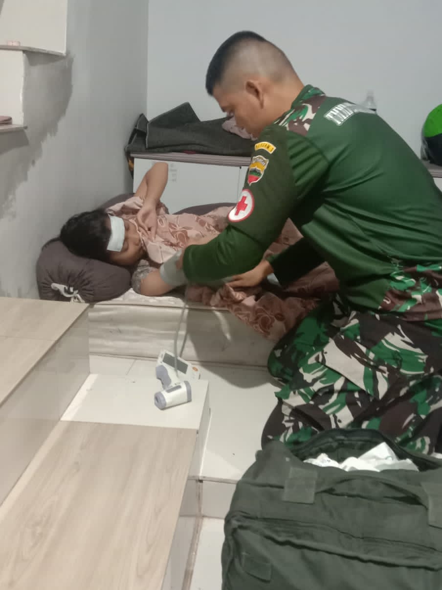 Dalam kesempatan tersebut Tim kesehatan Serda Afrison mengecek kondisi kesehatan Ibu Dahlia (38 Th) demam tinggi disertai diare, selanjutnya Serda Afrison melakukan  pemeriksaan tekanan darah dan suhu tubuh.