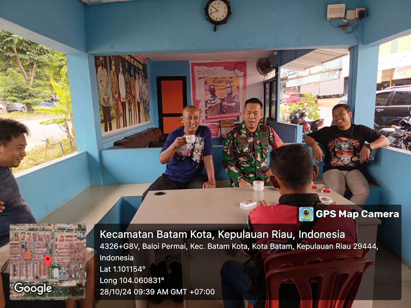 Batam [ER]- Babinsa 05 Baloi Permai Koramil 03/Nongsa Serda A.Marbun melaksanakan kegiatan komsos Pos Security kawasan Mega Legenda Kel Baloi Permai Kec Batam Kota.Senin [28/10/2024].