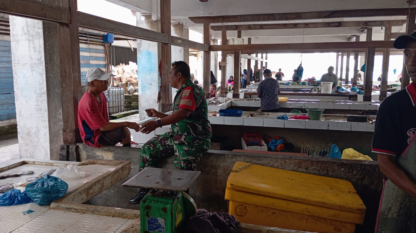 Dalam pelaksanaan kegiatan Komsos di wilayah binaan Babinsa 02 menyambangi para pedagang ikan di pasar induk Kelurahan Tanjung Sari seperti biasa kegiatan jual beli di pasar ini berjalan normal di banding bulan Februari yang lalu banyak kapak pedagang ikan yang kosong di sebab kan cuaca ekstrem namun saat ini kembali normal