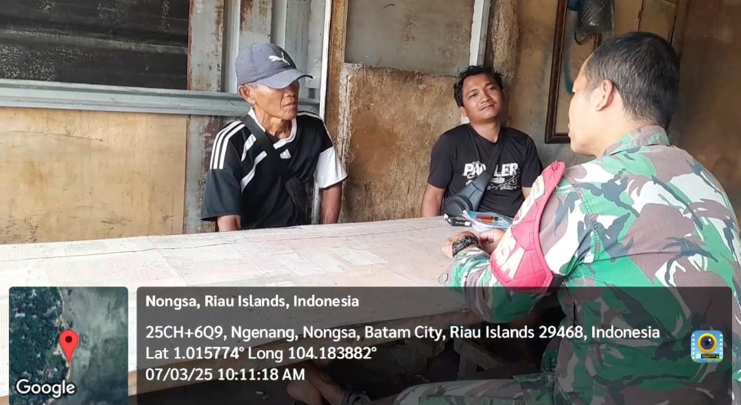 Batam- Babinsa 08 Kel.Ngenang Koramil 03/Nongsa Sertu Alexsander melaksanakan monitoring wilayah dan komsos bertempat di Rt1 Rw 2 Pulau Tjg Sauh Kel. Ngenang Kec. Nongsa. Jum’at [07/03/2025].