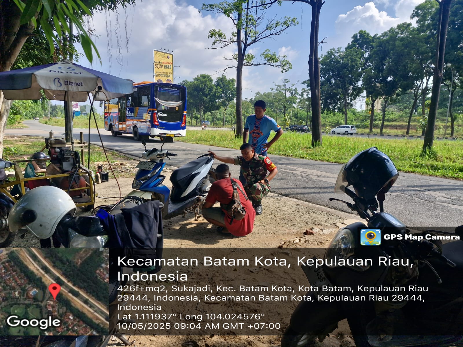 Batam-Babinsa 09 Kelurahan Sukajadi Koramil 03/Nongsa Serka Delfi indra melaksanakan Komsos bersama dengan Tukang tambal ban bertempat dijalur lambat Sukajadi kec.Batam Kota.Sabtu [10/05/2025].