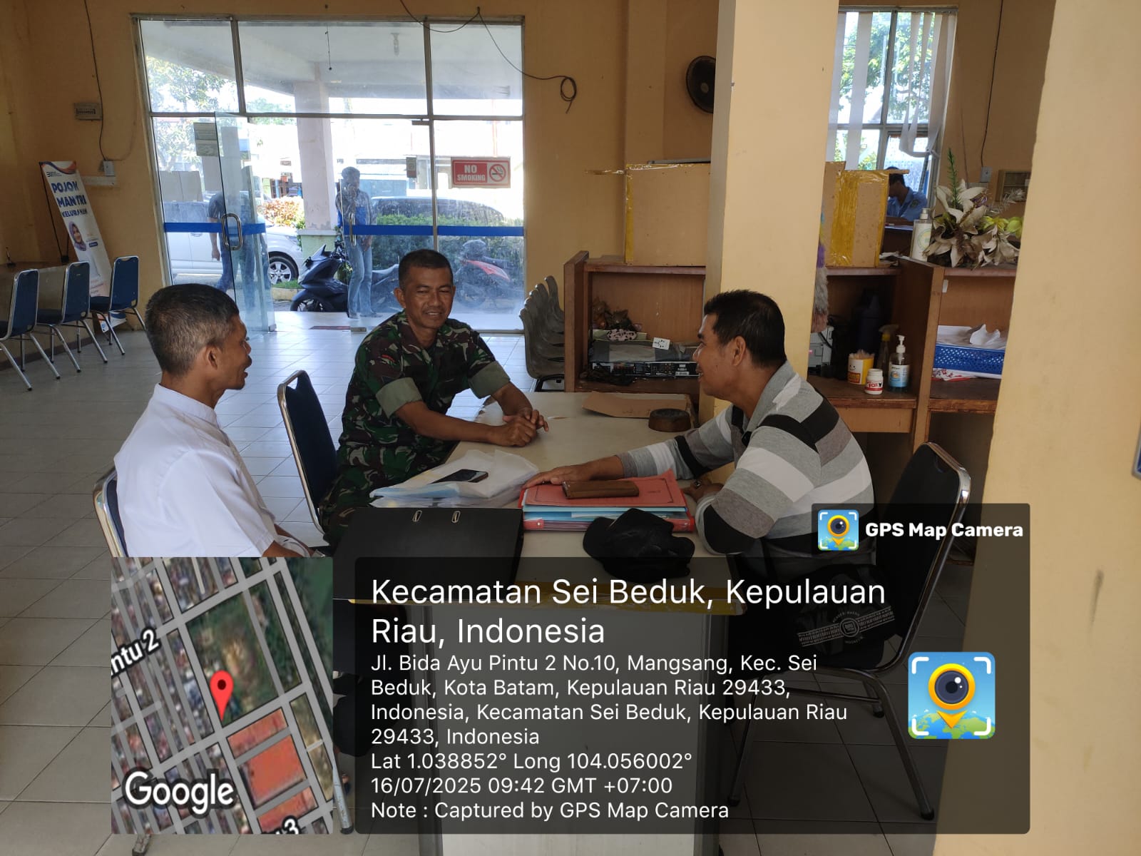 Batam-Babinsa 17/Mangsang Serka Imam melaksanakan kegiatan komsos dengan apem Kelurahan bertempat di kantor Kelurahan Mangsang Kec Sei Beduk Kota Batam.Rabu [16/07/2025].