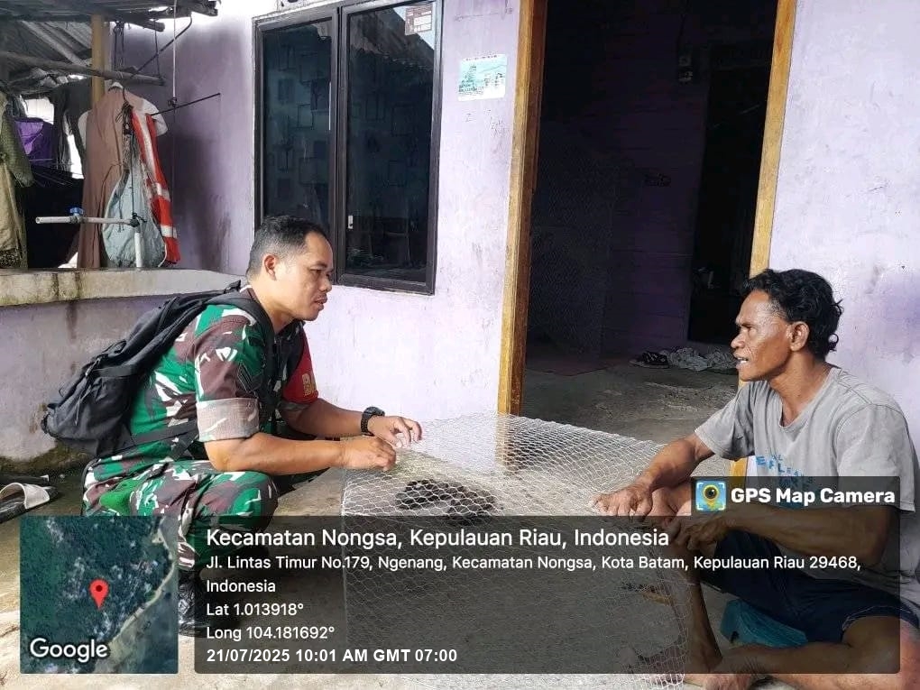 Batam-Babinsa 08 Ngenang Sertu Alexsander Koramil 03/Nongsa melaksanakan komsos bersama dengan warga binaan bertempat di pelantar rumah Bpk Khaidir Rt 1 Rw 2 Pulau Kubung Kel.Ngenang Kec Nongsa.Senin [21/07/2025].