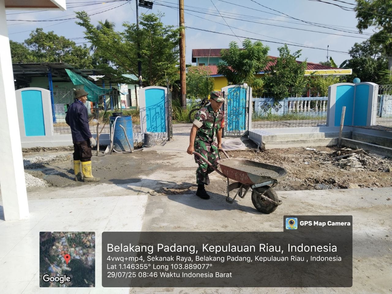 Dalam kegiatan tersebut, Babinsa turut membantu tukang mendorong gerobak berisi adukan semen untuk pembuatan lantai garasi rumah warga. Hal ini menjadi bentuk nyata kedekatan dan kepedulian Babinsa terhadap masyarakat.