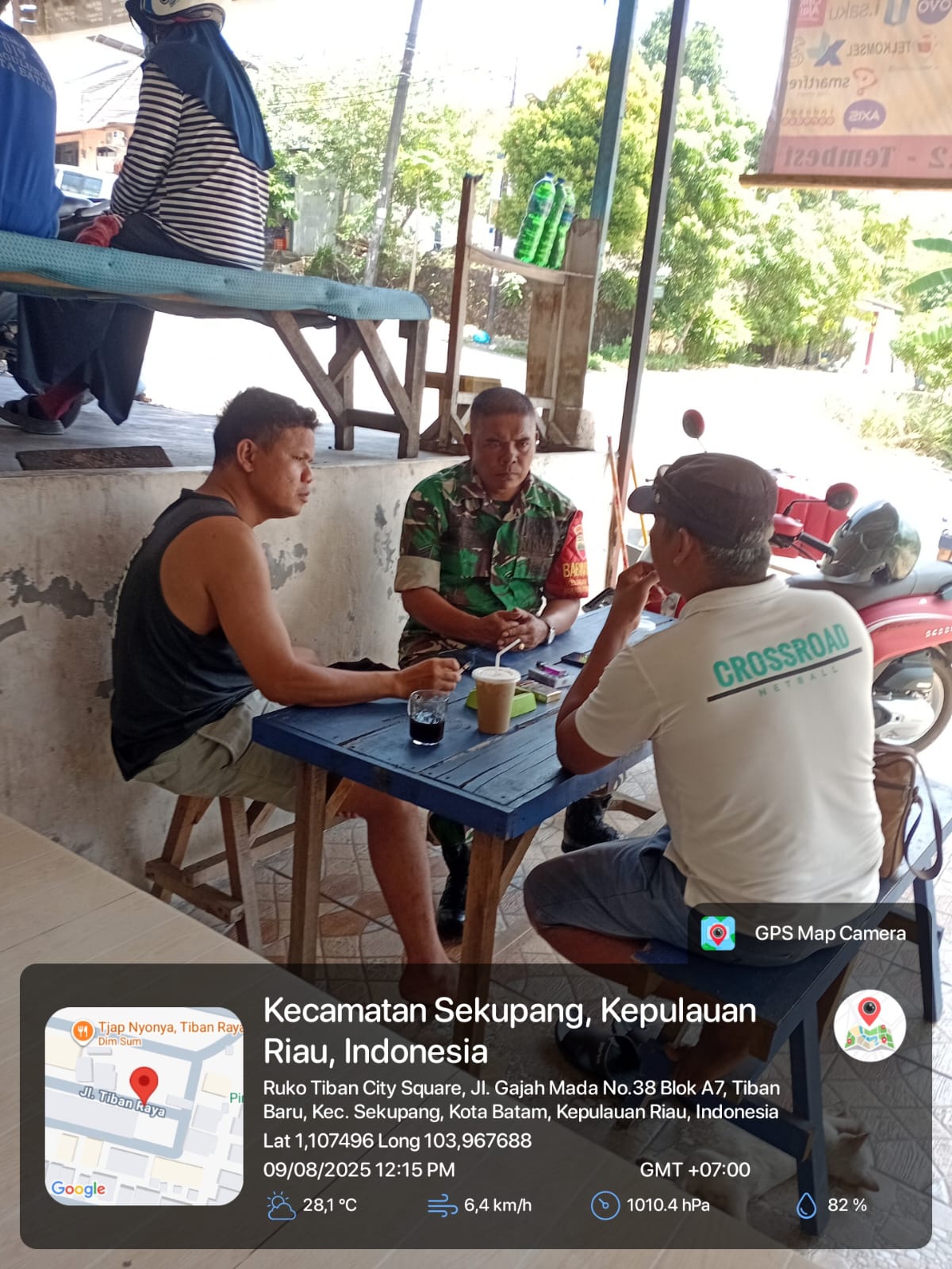 Batam-Babinsa Kelurahan Tiban Baru Koramil 02/Sekupang, Serka T. Siburian, melaksanakan komunikasi sosial (Komsos) bersama warga binaan di Komplek Ruko Tiban Raya, Kelurahan Tiban Baru, Kecamatan Sekupang, pada Sabtu (9/8/2025) pukul 11.30 WIB.