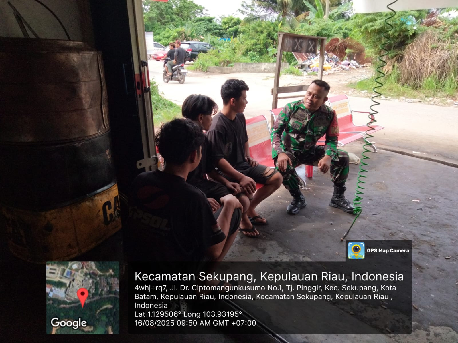 Batam-Babinsa 14 Kelurahan Bukit Tempayan Koramil 02/Sekupang, Sertu Mukhtar, melaksanakan kegiatan Komunikasi Sosial (Komsos) bersama para mekanik bengkel sepeda motor di belakang Pasar Melayu, Kelurahan Bukit Tempayan, Kecamatan Batu Aji, Sabtu (16/8/2025).