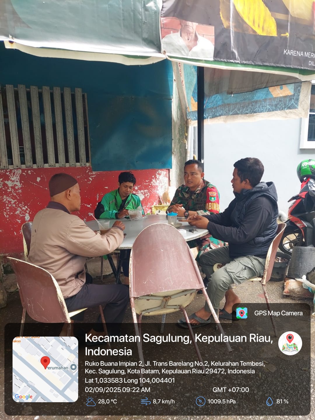 Batam-Babinsa 08 Kelurahan Tembesi, Koramil 02/Sekupang, Serka Adang Sutiawan, melaksanakan kegiatan komunikasi sosial (Komsos) bersama warga di wilayah binaannya, Selasa (2/9/2025). Kegiatan berlangsung pukul 09.00 WIB di Kelurahan Tembesi, Kecamatan Sagulung, dengan dihadiri beberapa tokoh masyarakat, di antaranya Zarman, Asnawi, dan Rudi.