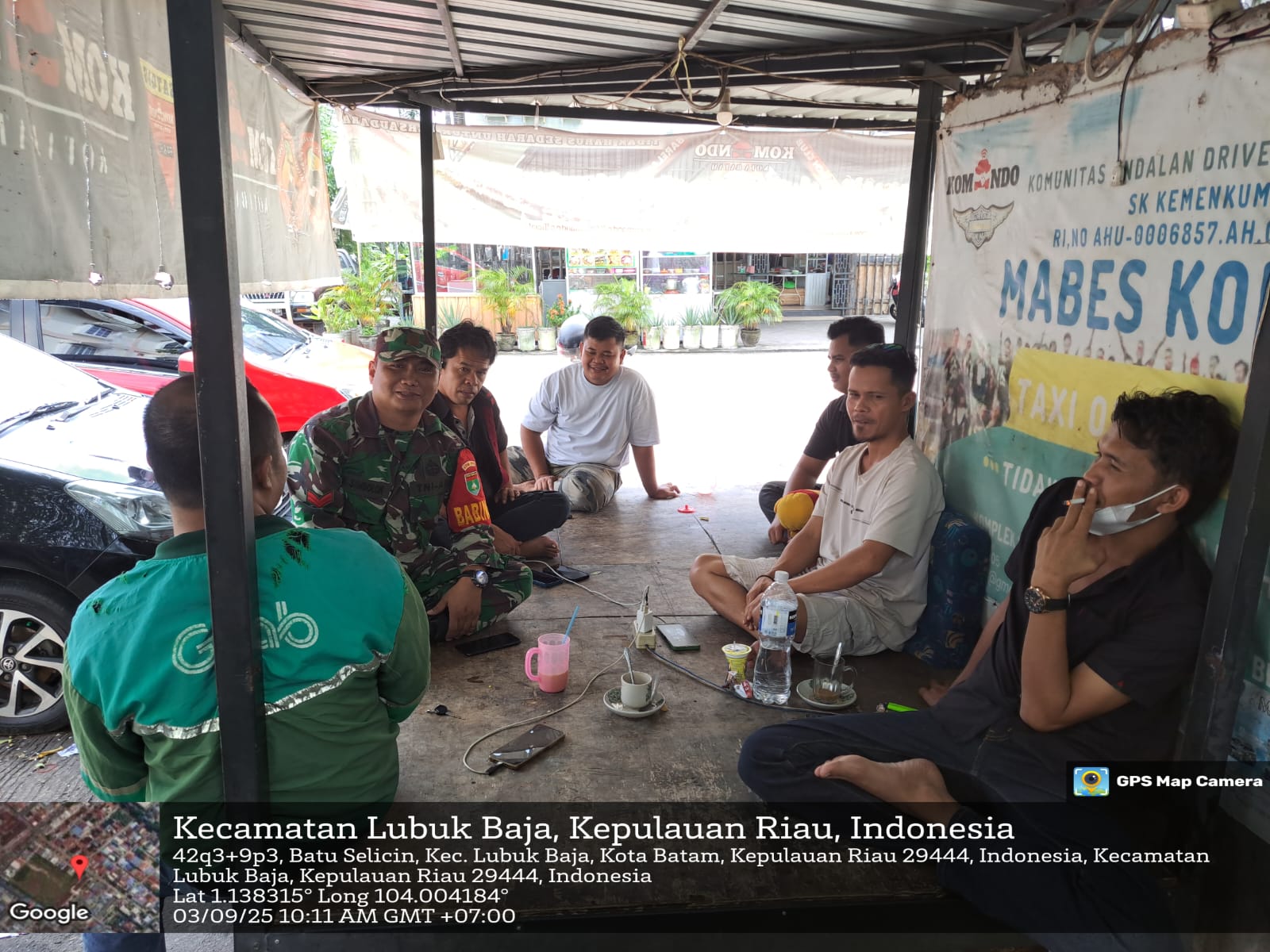 Detikinewsinfo.Com] Bintara Pembina Desa (Babinsa) Kelurahan Batu Selicin, Koramil 01/Lubuk Baja, Koptu Kamber Simbolon, melaksanakan kegiatan komunikasi sosial (komsos) bersama warga dan komunitas sopir taksi online di Komplek Marina Park, markas Taksi Online Komando, Kelurahan Batu Selicin, Kecamatan Lubuk Baja, Kamis (4/9/2025) pagi.