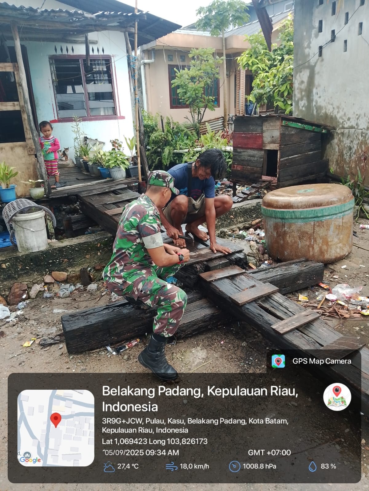 Kehadiran Babinsa tidak hanya untuk menjalin komunikasi, tetapi juga ikut membantu warga yang sedang membangun jembatan penghubung menuju salah satu rumah warga. Turut hadir dalam kegiatan tersebut, tokoh masyarakat setempat, Bapak Firdaus.