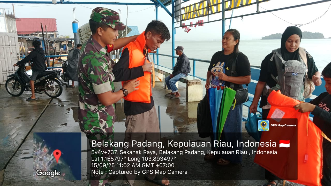 Batam – Dalam upaya meningkatkan keselamatan perjalanan laut dan mempererat kedekatan dengan warga, Babinsa 03 Kelurahan Pemping Koramil 05/Belakang Padang, Serka Eko Pranoto, melaksanakan kegiatan komunikasi sosial (Komsos) sekaligus membagikan life jacket kepada penumpang boat pancung di Pelabuhan Kuning, Kecamatan Belakang Padang, Senin (15/9/2025) pagi.