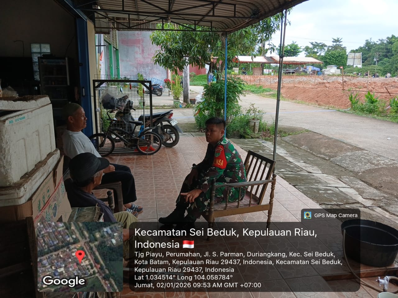 Pada Jumat (2/1/2026) pagi, Babinsa 16 Kelurahan Duriangkang, Kopral Dua (Kopda) B. Nababan, melaksanakan komsos bersama warga di Perumahan Perumnas, RT 01 RW 15, Kelurahan Duriangkang, Kecamatan Sei Beduk, Kota Batam. Kegiatan dimulai sekitar pukul 09.45 WIB dan berlangsung dalam suasana akrab serta penuh kekeluargaan.