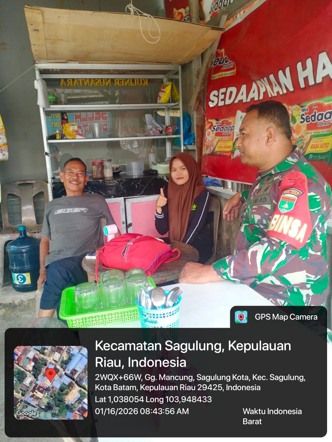 Batam- Dalam rangka memperkuat pembinaan teritorial serta menjaga kondusivitas wilayah binaan, Babinsa Kelurahan Sagulung Kota Koramil 02/Sekupang melaksanakan kegiatan komunikasi sosial (komsos) bersama warga, Jumat (16/1/2026) pagi.