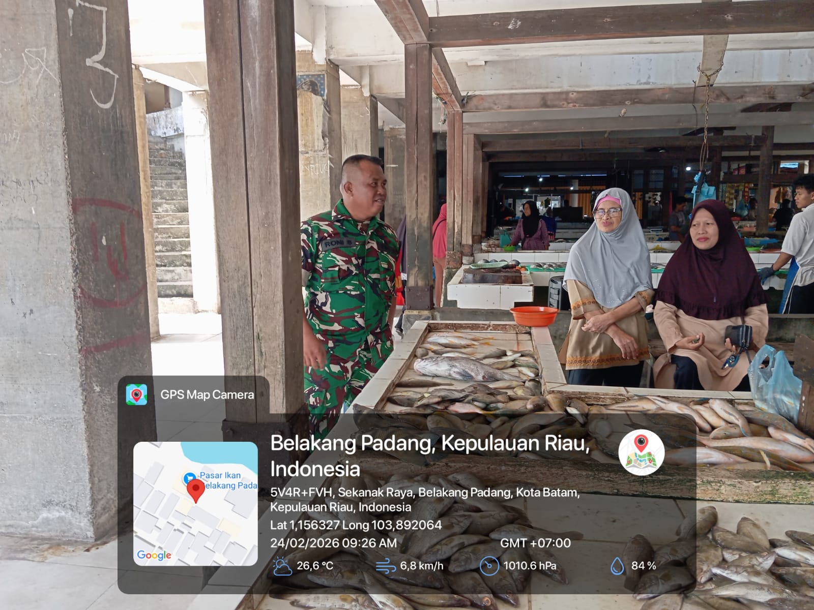 Batam- Babinsa Pemping dari Koramil 05/Belakang Padang melaksanakan kegiatan komunikasi sosial (komsos) bersama para pedagang ikan dan warga binaan di Pasar Induk Kecamatan Belakang Padang, Selasa (24/2/2026) pagi.