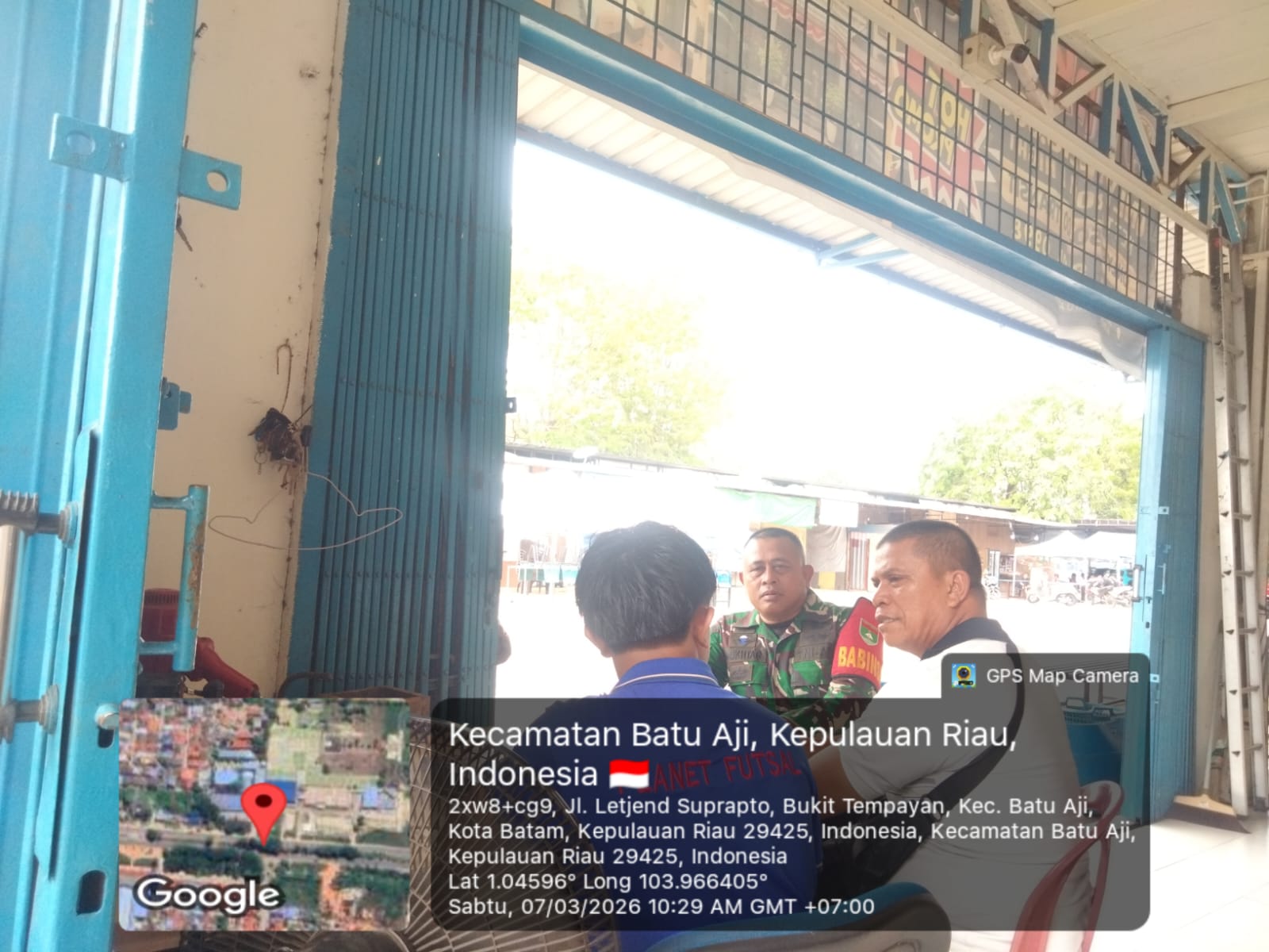 Batam-Dalam upaya memperkuat keamanan dan ketertiban lingkungan, Babinsa Kelurahan Bukit Tempayan Koramil 02/Sekupang melaksanakan kegiatan komunikasi sosial (komsos) bersama aparatur kelurahan dan petugas keamanan setempat, Sabtu (7/3/2026).