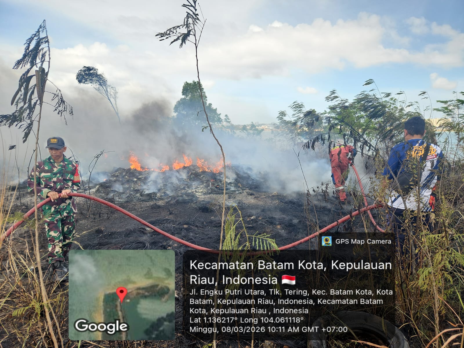 BATAM – Babinsa Kelurahan Belian, Koramil 03/Nongsa, turut membantu penanganan kebakaran lahan kosong yang terjadi di samping Gedung Sumatra, RT 004 RW 002, Kelurahan Belian, Kecamatan Batam Kota, Minggu (8/3/2026) pagi.