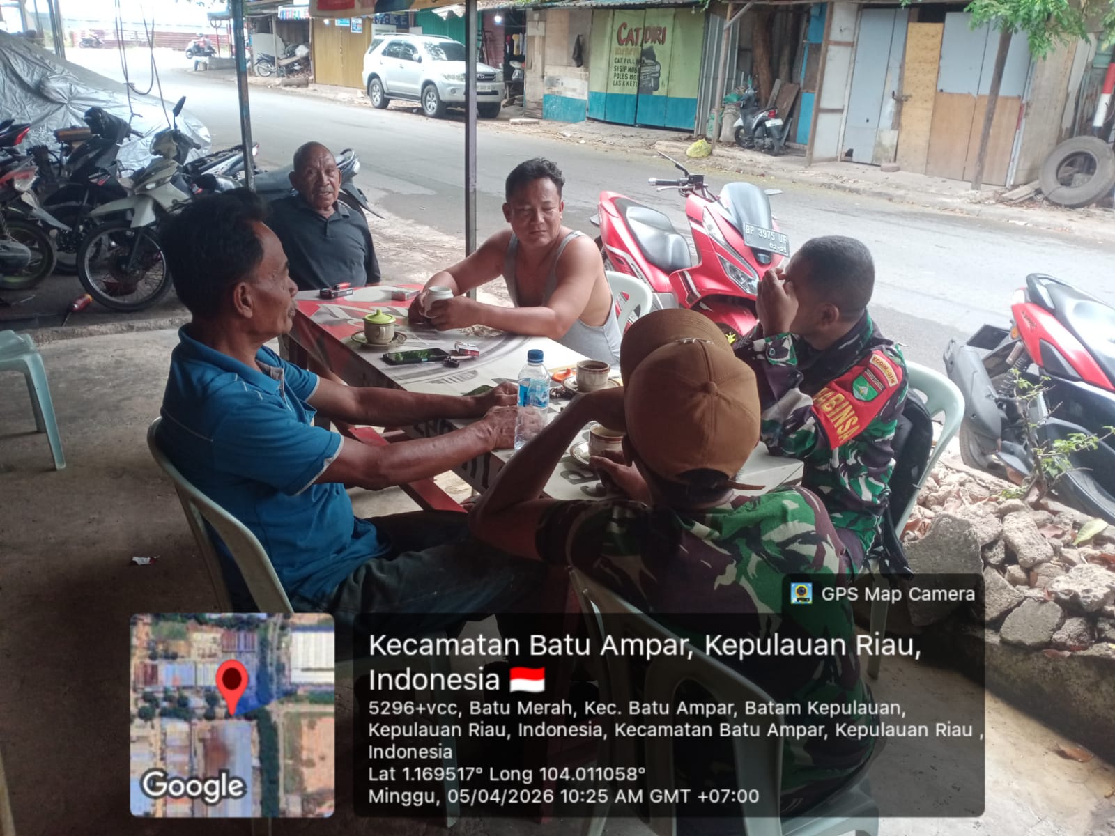Batam-Upaya menjaga stabilitas keamanan dan ketertiban masyarakat terus dilakukan oleh aparat kewilayahan. Salah satunya melalui kegiatan komunikasi sosial (komsos) yang dilaksanakan Babinsa Kelurahan Batu Merah, Koramil 01 Lubuk Baja, bersama warga di wilayah binaan, Minggu (5/4/2026).
