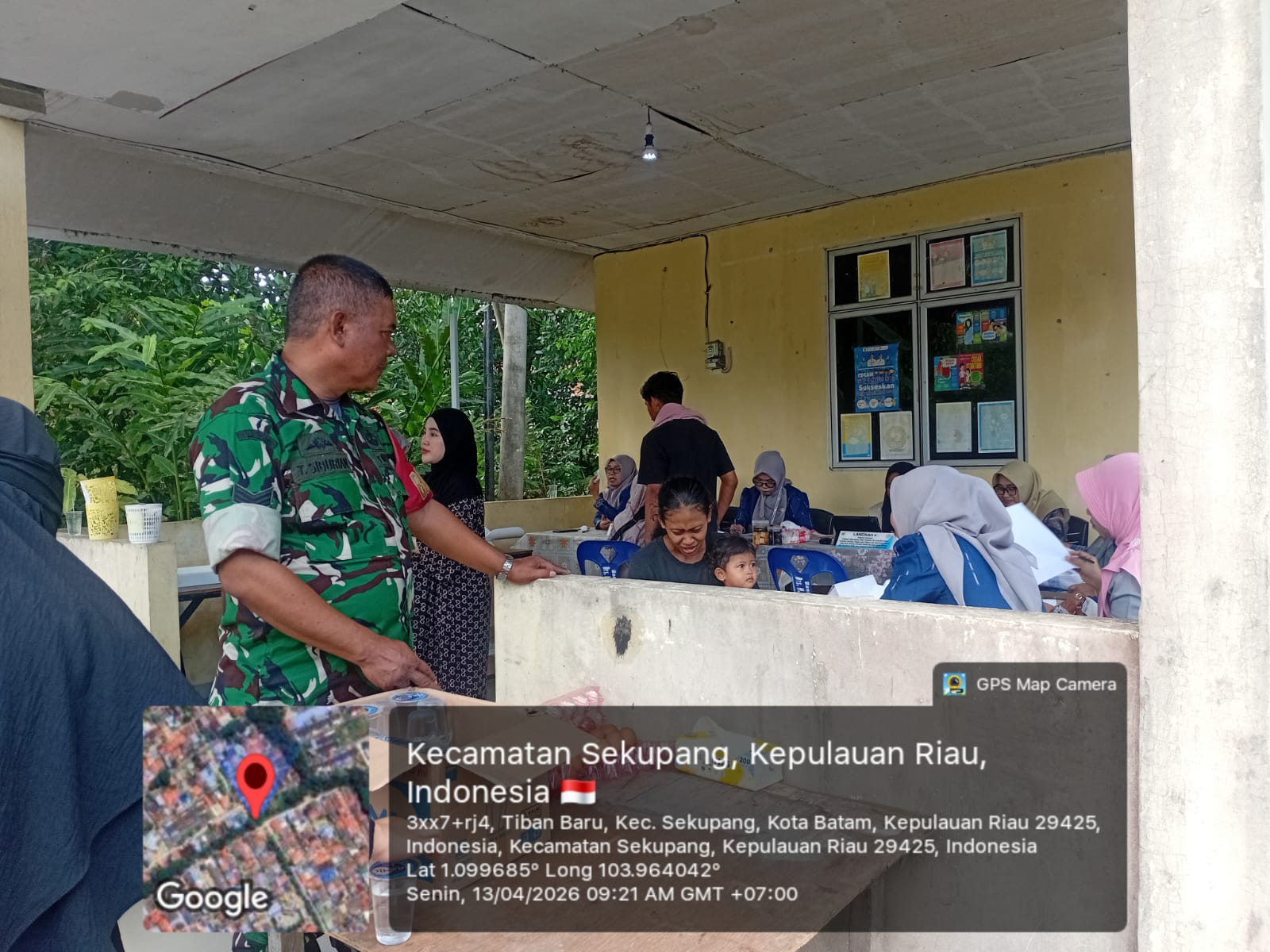 Hal ini tercermin dalam kegiatan yang dilaksanakan Babinsa Kelurahan Tiban Baru, Koramil 02/Sekupang, Serka T. Siburian, yang melakukan monitoring dan pendampingan kegiatan Posyandu Balita dan Lansia di Posyandu Bougenville 13, Perumahan Tiban Koperasi, Kecamatan Sekupang, Kota Batam, Senin (13/4/2026).