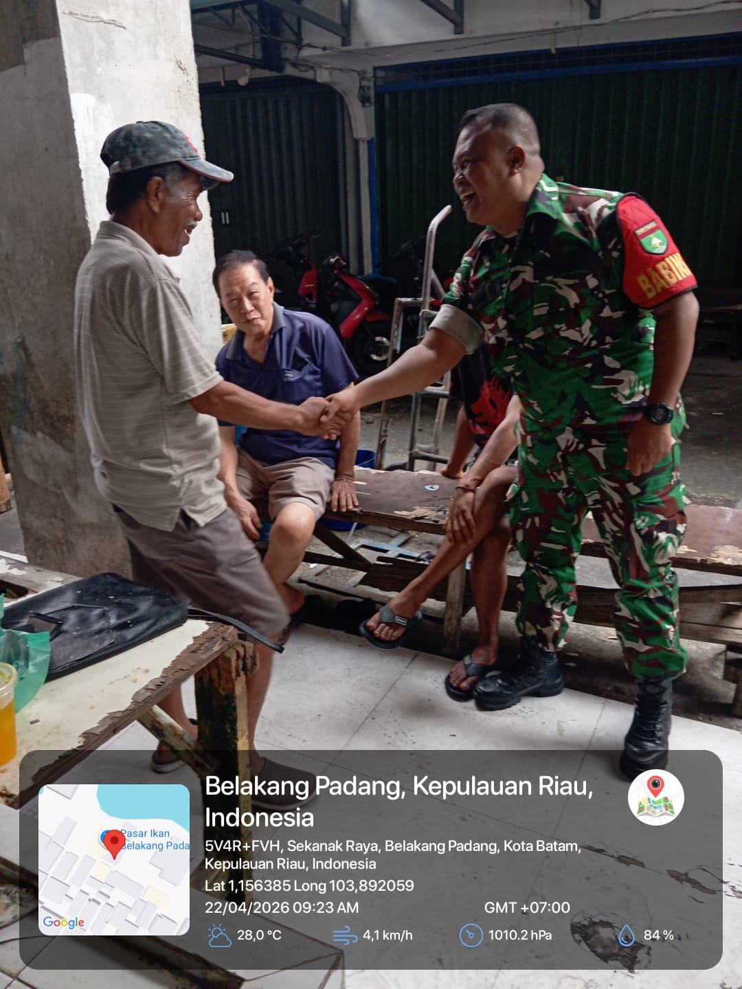 Batam- Upaya menjaga kenyamanan dan keselamatan masyarakat terus dilakukan aparat kewilayahan. Babinsa Koramil 05 Belakang Padang, Serda Roni Sitorus, melaksanakan kegiatan komunikasi sosial (komsos) bersama warga binaan di Pasar Induk Kelurahan Pemping, Kecamatan Belakang Padang, Rabu (22/4/2026).